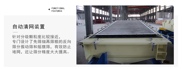 ★自動清網裝置種類較多,自清網效果好;針對分級顆粒度比較接近,分級時有靜電起球且易堵網的物料,我公司專門設計了先篩細再篩粗的反向(反向篩分)篩分振動篩和搖擺篩,不但有效防止了堵網,還讓篩分精度大大提高;