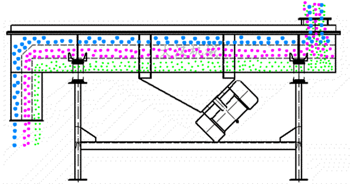 直線振動(dòng)篩利用振動(dòng)電機(jī)激振作為振動(dòng)動(dòng)力來源,使物料在篩網(wǎng)上被拋起,同時(shí)向前作直線運(yùn)動(dòng),物料從給料機(jī)均勻地進(jìn)入篩分機(jī)的進(jìn)料口,通過多層篩網(wǎng)產(chǎn)生數(shù)種規(guī)格的篩上物、篩下物、分別從各自的出口排出。