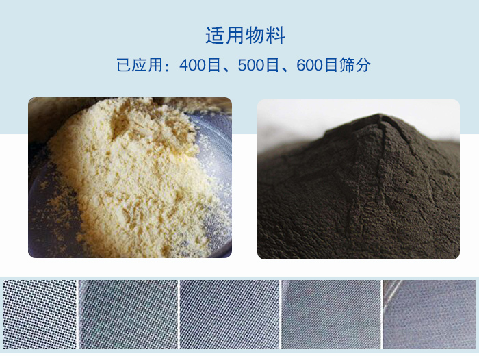 已應(yīng)用:400目、500目、600目篩分碳化硅、合金粉末、鉬粉、不銹鋼粉、鎢粉、鎳粉、鈷粉、粉末涂料、石英粉、丁米酮粉、麥芽粉、病毒唑、咖啡粉、電磁粉、負(fù)極材料、激光粉。