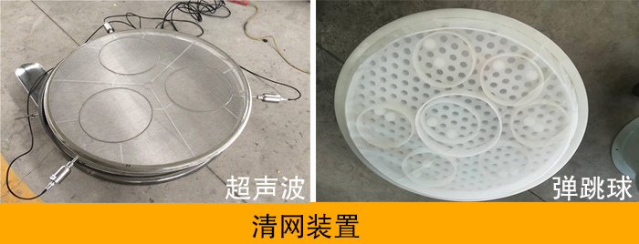一般來說清網裝置有:彈跳球和超聲波清網裝置。彈跳球采用硅膠材質,受到設備激振力的振動擊打篩面來實現清網效果。超聲波清網裝置是一種高是通過高頻低振幅超聲波使篩面物料浮空從而實現清網效果。