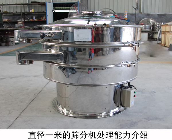 直徑一米的篩分機(jī)功率為0.75kw,篩分直徑為920m/m,入粒粒度小于10mm,電壓為380V,轉(zhuǎn)速達(dá)到1440r/min,以物料為大砂的干式篩分條件下,可處理800kg/h,篩分產(chǎn)量相對(duì)較大,屬于旋振篩里的中型設(shè)備。