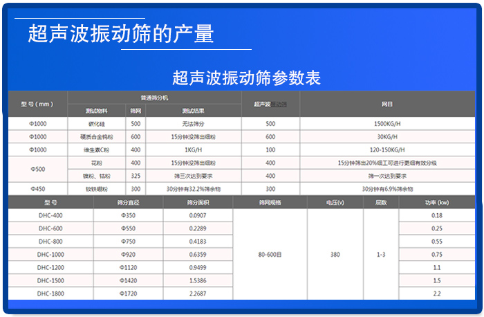 超聲波振動(dòng)篩價(jià)格差異大的一大因素就是因?yàn)楫a(chǎn)量的差異非常大,產(chǎn)量越高,篩分的物料就越多,帶來(lái)的經(jīng)濟(jì)效益就越多,價(jià)格就越高。具體的參數(shù)如上圖所示。