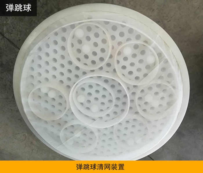彈跳球清網裝置是為常見的清網裝置。其形狀為圓形,材質可分為橡膠材質與硅膠材質兩種。其工作原理是均勻的分布在托球板上,一般十公分內分布5-8個。篩機在振動篩分的同時彈跳球也隨之跳躍擊打篩網,從而起到清網的目的,常見的使用機型有旋振篩