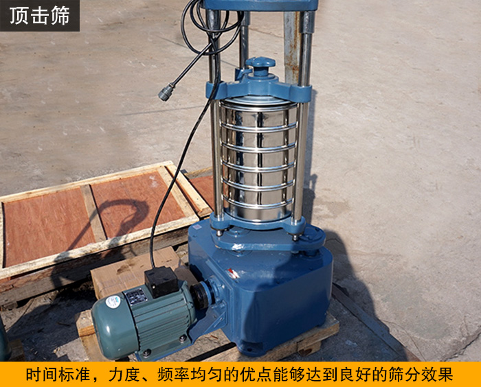 頂擊式標準振篩機又名頂擊式標準振動篩,符合建材、地質、交通,化工等等行業有關測試規范和要求。利用偏心的原理使機器的平臺面發生有規律震動和頂擊,主要配套標準分樣篩使用,代替手工篩,篩分物料的級別。具有時間標準,力度、頻率均勻的優點能達到良好的篩分效果,適用于建筑、公路,地質、冶金、化工、煤炭、磨料、食品、飼料,醫藥等部門的實驗室或化驗室對顆粒物料進行篩分分析,篩可以配各種規格的方孔、圓孔標準套篩,是生化實驗室、分析室、教育科研的必備篩分設備。